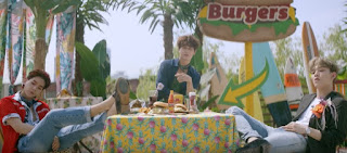 It showed EXO danced along while looked calm and free. They surrounded with colorful elements such as garden setting and car property. The boys styling were also bright. They played up with patterned shirts and unique hairstyles.